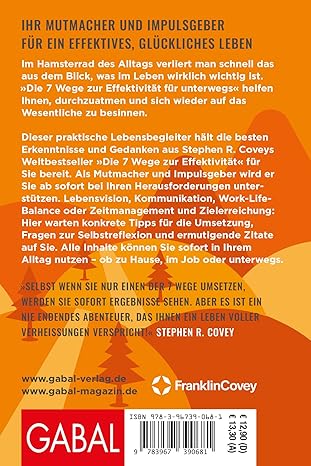 Dieser Lebensbegleiter im Taschenformat ist durch und durch inspiriert von Stephen R. Coveys internationalem Bestseller „Die 7 Wege zur Effektivität“. Konkrete Impulse, Fragen zur Selbstreflexion und ermutigende Zitate von Stephen R. Covey geben Ihnen einen Leitfaden an die Hand, um persönlich und beruflich effektiver zu werden.