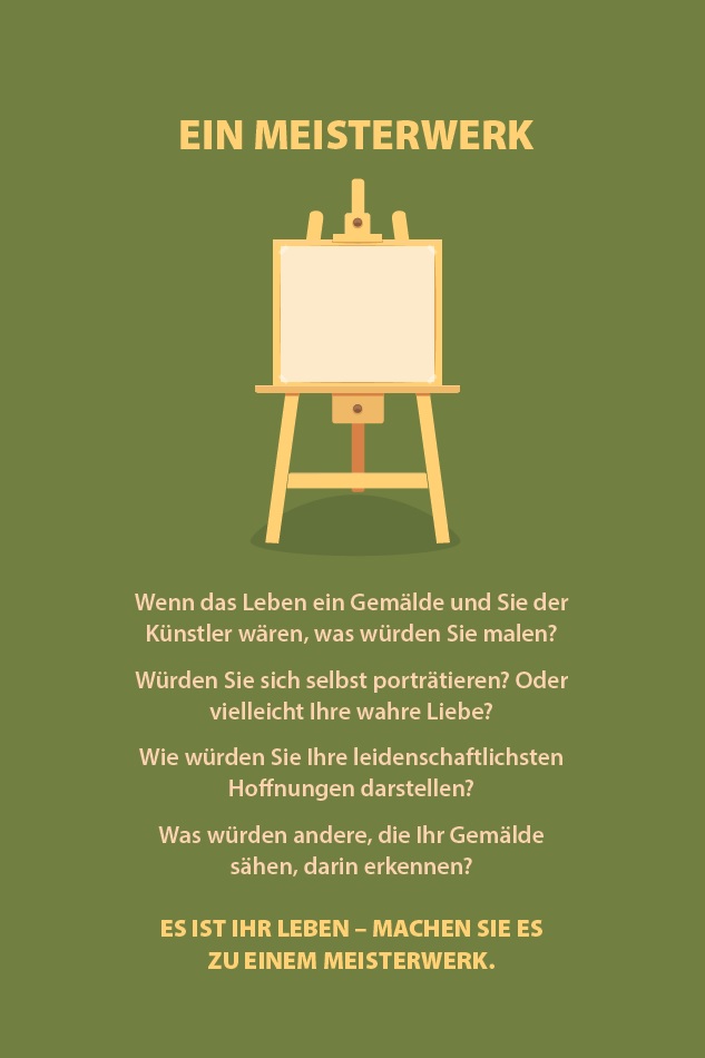 • Stellen Sie sich Ihr Leben als ein von Ihnen geschaffenes Gemälde vor. Wie gestalten Sie es? Beschreiben Sie, wie Sie der Reihe nach vorgehen – oder am liebsten vorgehen würden –, um ein Meisterwerk zu schaffen.